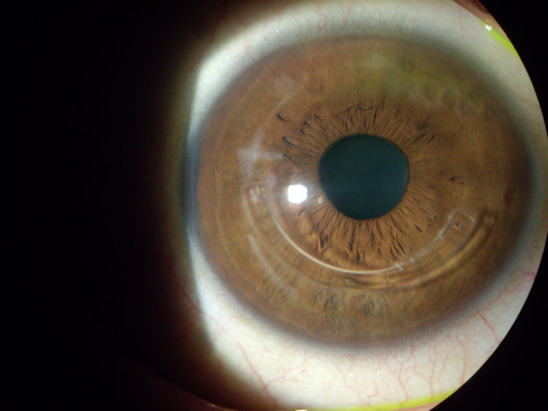 На фотографии ниже представлена роговица пациента, перенесшего операцию LASIK в 2007 году. Эта роговица чрезвычайно сухая и неправильной формы. Кроме того, эпителиальные клетки с внешней поверхности роговицы проникли под лоскут LASIK и выросли под ним. С 5:00 до 8:00 часов клетки можно увидеть в виде белой линии, идущей от нижней части роговицы. Пациент носит специальную газопроницаемую склеральную линзу для защиты травмированной ткани роговицы. Нажмите на изображение, чтобы увеличить.