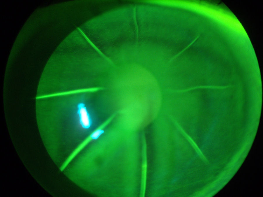 На двух изображениях ниже изображены левый и правый глаза пациента, у которого было два отдельных глаза. рк в 1992 году были проведены операции на каждом глазу, а в 2002 году - LASIK. Эти фотографии были сделаны с помощью щелевой лампы (биомикроскопа) после окрашивания глаза флуоресцеином. Синий свет используется для освещения участков окрашивания, которые указывают на повреждение роговицы. Обратите внимание, что разрезы RK и края лоскута LASIK окрашены в зелено-желтый цвет, что указывает на открытые раны.