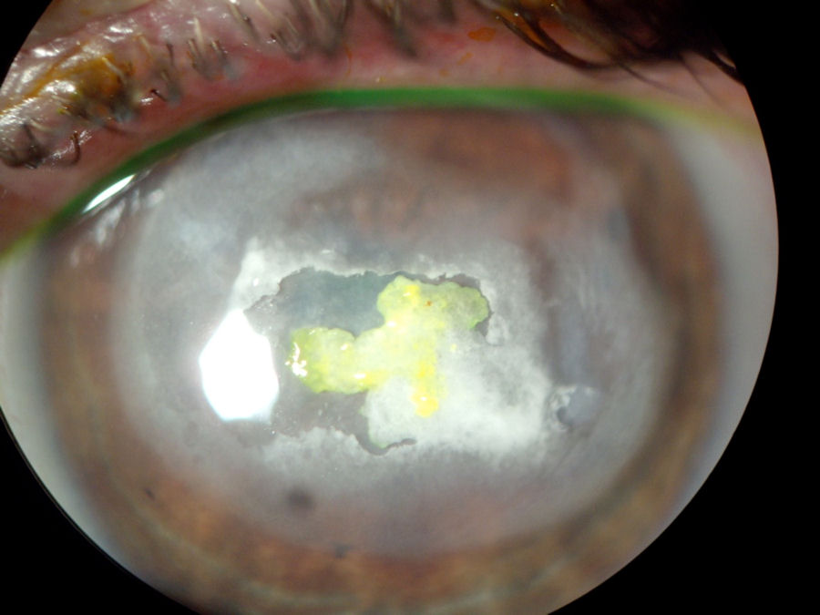 На фотографии ниже представлен глаз пациента, перенесшего операцию LASIK в 2003 году. Край лоскута LASIK все еще виден на этой фотографии 2012 года, демонстрирующей неспособность лоскута к заживлению У пациента есть болезнь сухого глаза , которые проявляются в виде сухих пятен на роговице. (Для освещения поврежденных тканей после закапывания зеленого красителя в глаз используется специальный свет). Небольшие, плохо очерченные овальные или круглые участки чуть ниже лоскута LASIK между 11:00 и 1:00 - это врастание эпителия У пациента также есть эктазия после операции LASIK Нажмите на фотографию, чтобы увеличить ее.