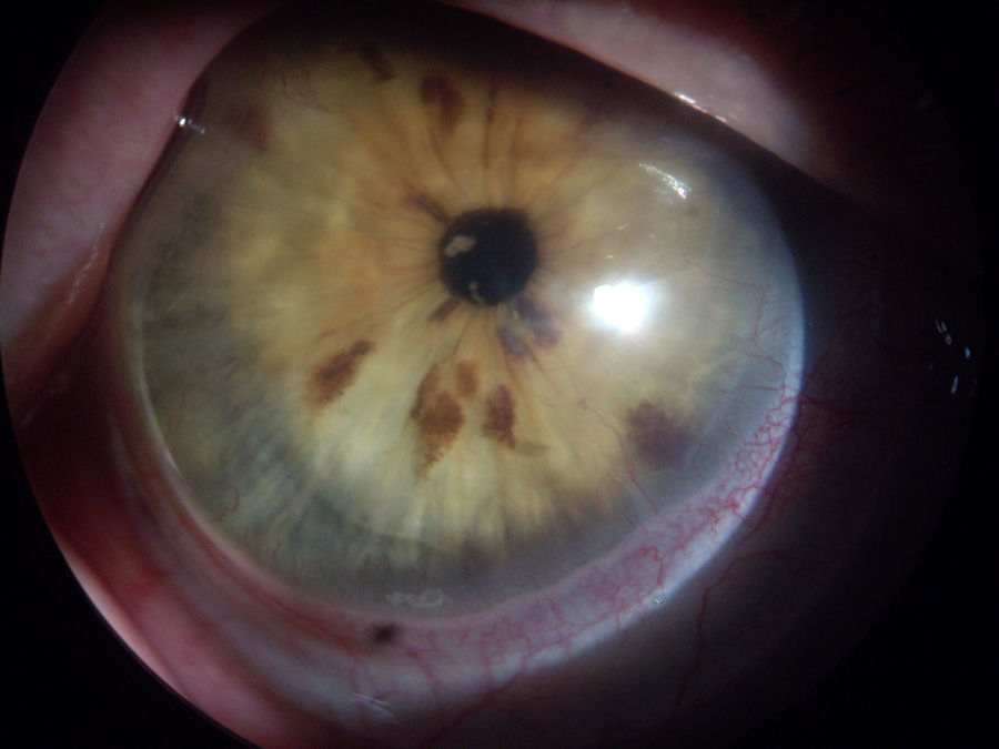 На фотографии ниже показан глаз пациента, у которого был РК (радиальная кератотомия) в 1988 году, а пятнадцать лет спустя, в 2003 году, была проведена операция LASIK. Белая стрелка указывает на один из незаживших разрезов RK (радиальные линии). Красная стрелка указывает на незаживший край лоскута LASIK. Зрение пациента сильно искажено. Нажмите на фотографию, чтобы увеличить.