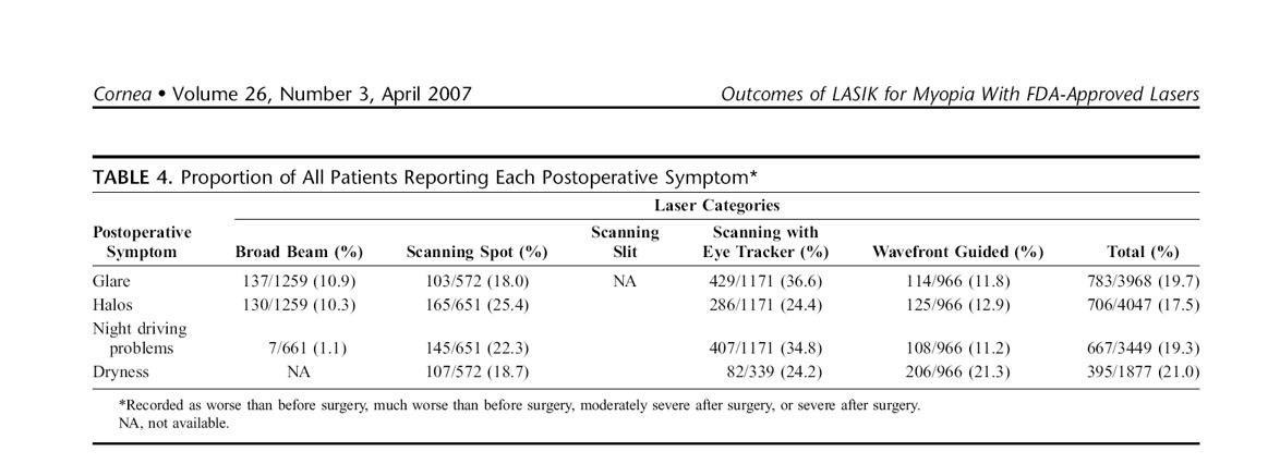 31,2% пациентов, участвовавших в клиническом исследовании Bausch & Lomb Zyoptix FDA, сообщили об усилении или значительно более выраженной сухости глаз через шесть месяцев после LASIK. Источник (страница 17)