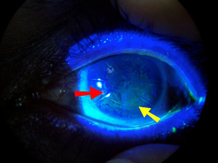 На фотографии ниже показана роговица пациента, у которого была РК (радиальная кератотомия) пятнадцать лет назад, а затем девять лет назад была проведена операция LASIK. На снимке видны разрезы RK. Красная стрелка указывает на край лоскута LASIK. Как и разрезы RK, лоскут LASIK никогда не заживает полностью. Желтая стрелка указывает на окрашивание эпителиальных клеток роговицы, которые больше не жизнеспособны из-за синдрома сухого глаза после операции LASIK.