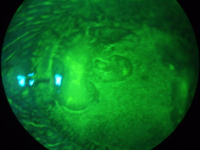 Приведенные ниже фотографии были сделаны с помощью щелевой лампы (биом-микроскопа) после инстилляции флуоресцеиновый краситель . Синий свет используется для подсветки красителя, который окрашивает поврежденные участки роговицы. Желто-зеленый круг по периферии роговицы - это край лоскута LASIK. Он окрашивается, потому что граница раздела все еще открыта, что свидетельствует о неспособности роговицы к полному заживлению.