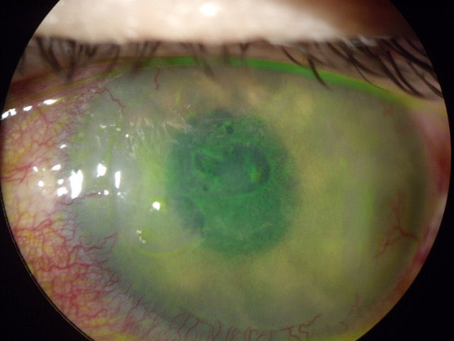На следующей фотографии изображена роговица пациента, перенесшего операцию LASIK в 2005 году. Глубокое окрашивание по краю лоскута LASIK указывает на наличие открытого отверстия на стыке роговицы и лоскута, что подвергает пациента риску инфицирования условно-патогенными организмами, такими как вирусы и бактерии.