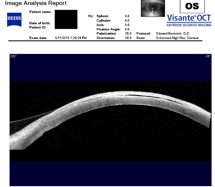 Следующие изображения были получены с использованием метода, называемого оптической когерентной томографией, или ОКТ. Прибор позволяет получить изображение в поперечном сечении путем сканирования передней части глаза (переднего сегмента) лучом света. Думайте об этом как об ультразвуке, использующем свет вместо звуковых волн для создания изображения живых тканей.